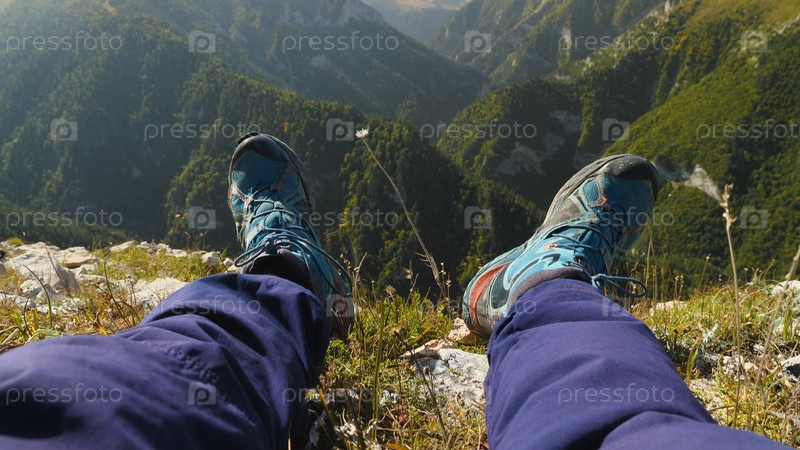 Вид от первого лица на мужские ноги в синих походных ботинках на краю обрыва. На заднем плане открывается красивая панорама горного ущелья. Летний поход в горы