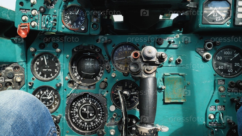 Кабина старого советского истребителя МиГ-23. Крупный план приборов, датчиков и элементов управления. Переключатели, кнопки и аналоговое управление списанного военного самолета