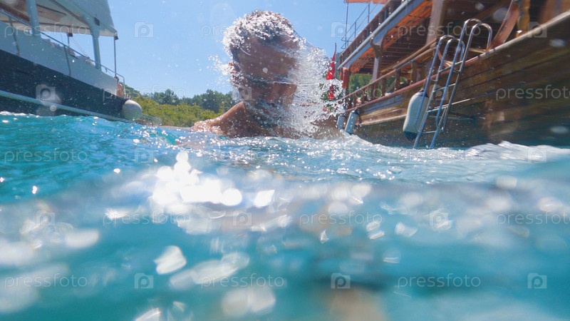 Мужчина выходит из моря и стряхивает воду движением головы. Рядом с ним стоят на якоре два прогулочных катера или яхты. Подводная фотография, концепция летнего путешествия
