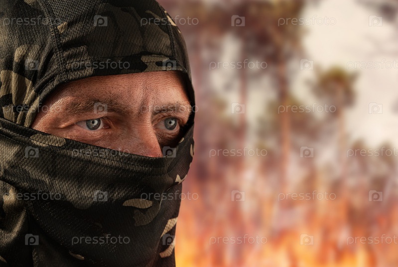 Военный в камуфляжной маске на фоне горящего леса. Понятие военных действий. Человек на войне. Пожар после взрывов. Лесной пожар. Поджигатель. Крупный план лица в балаклаве
