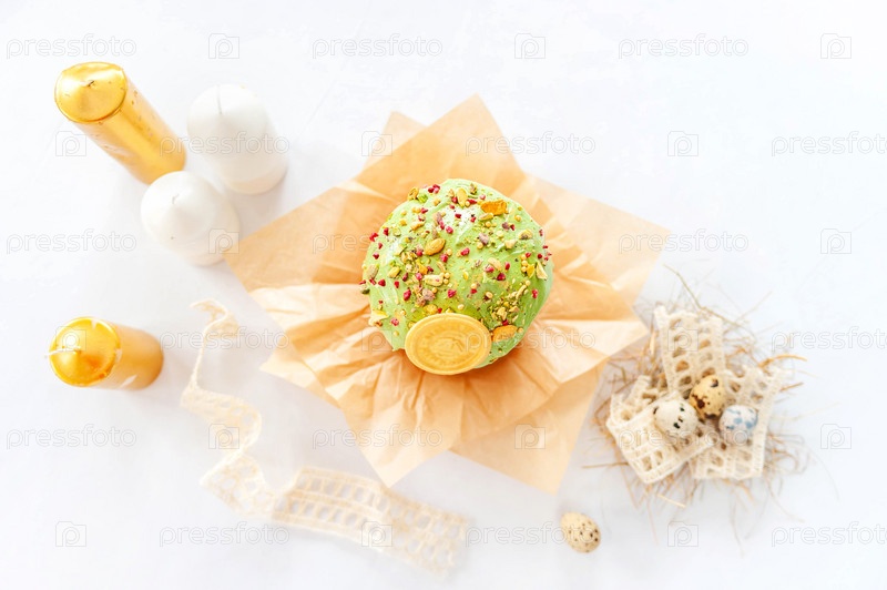 Традиционный пасхальный кулич или сладкий хлеб, перепелиные яйца на белом фоне