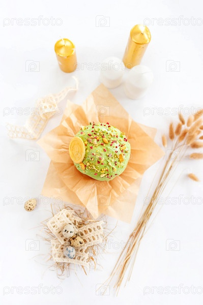 Традиционный пасхальный кулич или сладкий хлеб, перепелиные яйца на белом фоне