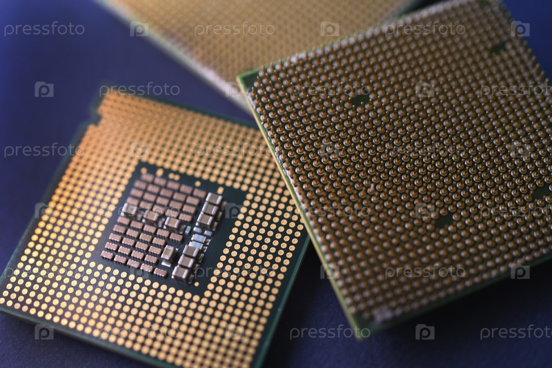 Компьютерный процессор на синем фоне. Контакты на корпусе процессора