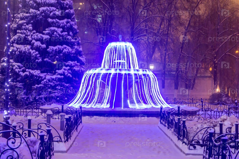 Зимний фонтан с гирляндами в парке