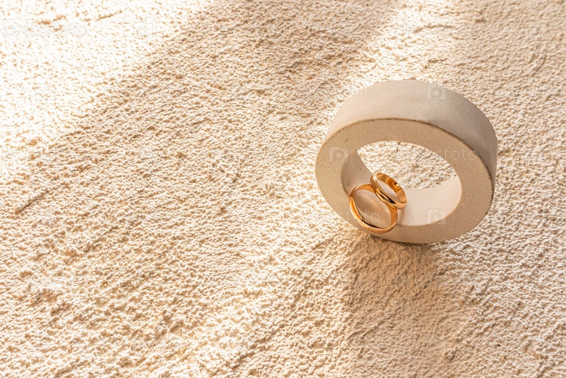Два золотых обручальных кольца лежат внутри бетонного круглого подиума с тенью от солнечных лучей. Бетонный рельеф песочного цвета фона. Копировальное пространство