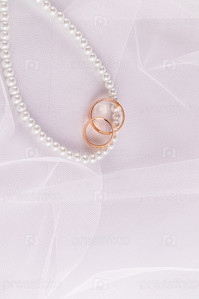 Фоновое изображение для свадебного дизайна или макета. Два золотых обручальных кольца лежат на жемчужных бусинах на белой классической фате. Вид сверху. Копировальное пространство