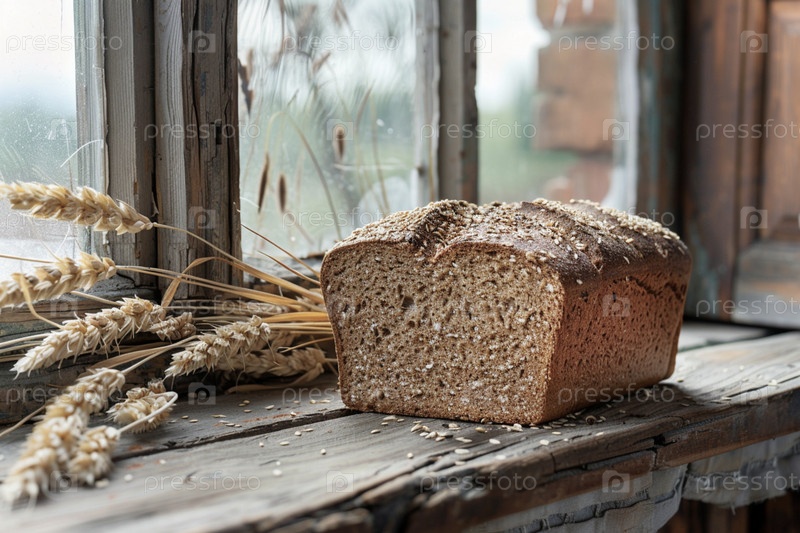 На старом деревянном подоконнике черный хлеб, натюрморт и концепция деревенской жизни