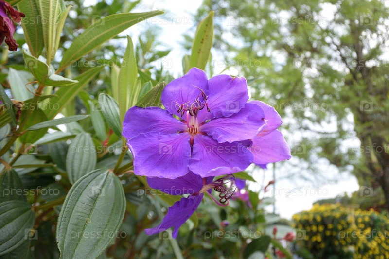 Крупные фиолетовые цветы с темно-зелеными листьями