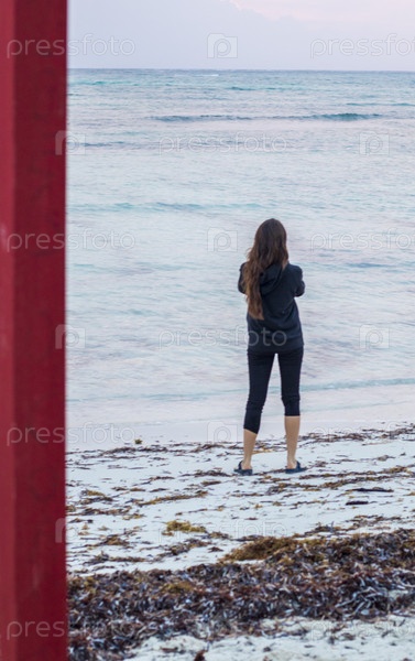Снимок женщины на берегу моря с мобильным телефоном в час восхода солнца. На открытом воздухе
