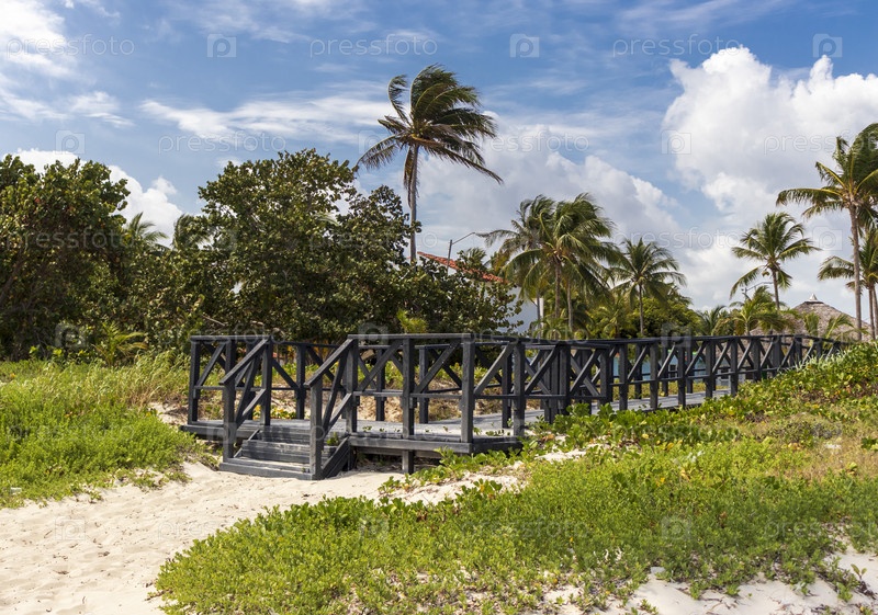 Деревянная дорожка идет от пляжа к хижине на тропическом острове. Праздничный день