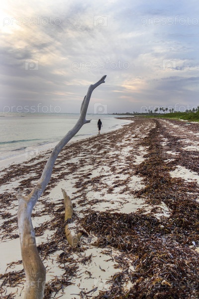 Снимок женщины на берегу моря с мобильным телефоном в час восхода солнца. Люди