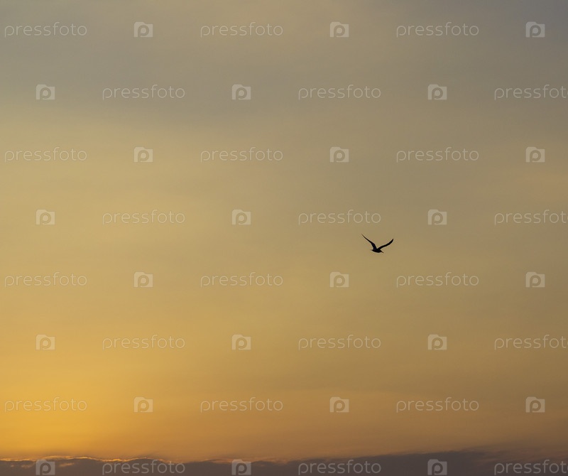Выстрел драматического восхода солнца у моря. Чайка в небе. Природа