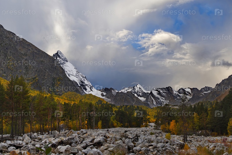 Россия. Кабардино-Балкария. Вид на заснеженные вершины Кавказских гор на закате осеннего дня