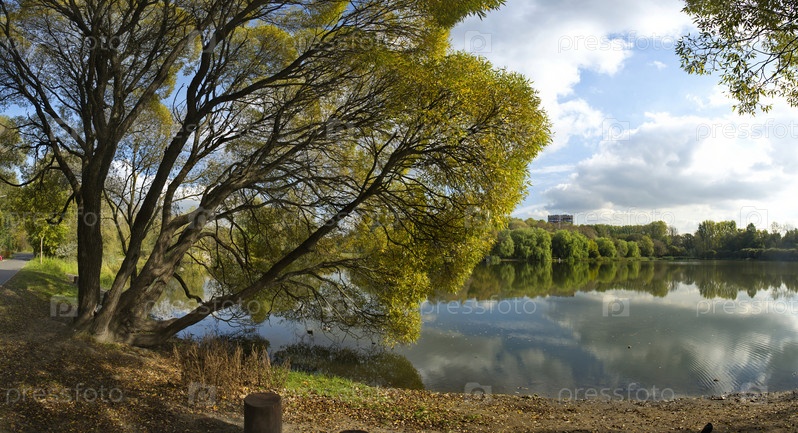 Россия. Московский парк Покровское-Стрешнево. Вид на полупрозрачные кроны реликтовых ив, похожие на кружевной тюль, на заросших берегах парковых прудов