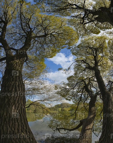 Россия. Московский парк Покровское-Стрешнево. Вид на полупрозрачные кроны реликтовых ив, похожие на кружевной тюль, на заросших берегах парковых прудов