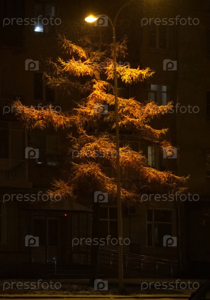Россия. Юг Западной Сибири, Новокузнецк. Осенние желтые лиственницы, освещенные уличными фонарями снежным вечером