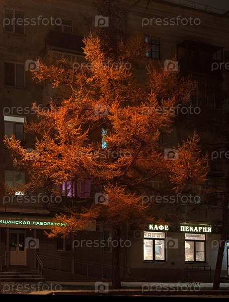 Россия. Юг Западной Сибири, Новокузнецк. Осенние желтые лиственницы, освещенные уличными фонарями снежным вечером