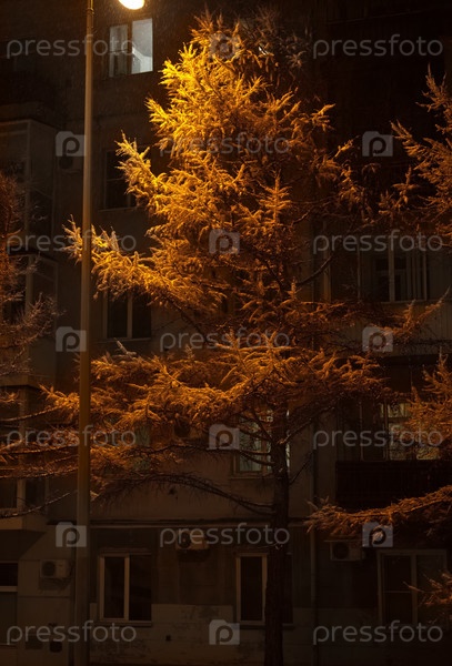 Россия. Юг Западной Сибири, Новокузнецк. Осенние желтые лиственницы, освещенные уличными фонарями снежным вечером