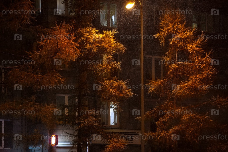 Россия. Юг Западной Сибири, Новокузнецк. Осенние желтые лиственницы, освещенные уличными фонарями снежным вечером