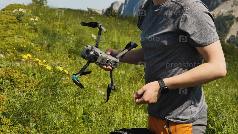 Мужчина держит квадрокоптер и готовит его к полету. Запуск дрона в горный поход. Коммерческий беспилотный самолет