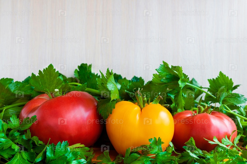 Свежие помидоры на деревянном столе со свежей петрушкой и зеленью сельдерея