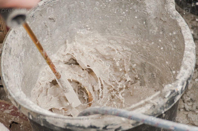Перемешивание краски в ведре перед покраской
