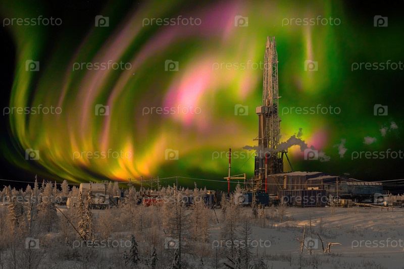 Зимний пейзаж полярной ночью с буровой установкой. Северное нефтегазовое месторождение. На заднем плане красивое небо с северным сиянием