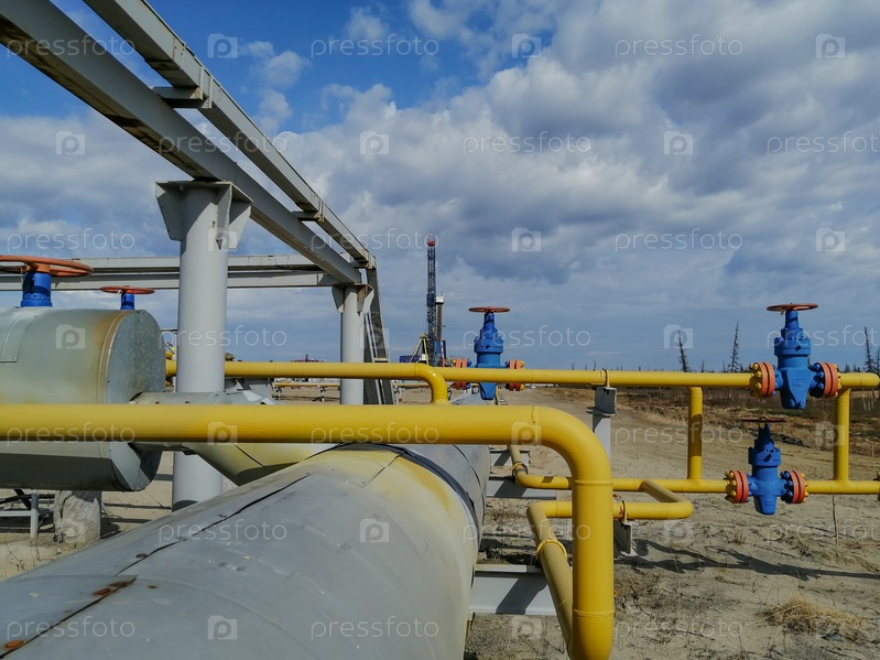 Трубопроводная арматура и манифольд добывающих газовых скважин на месторождении. Маховики для клапанов высокого давления. На заднем плане буровая установка. Размытие удаленных объектов
