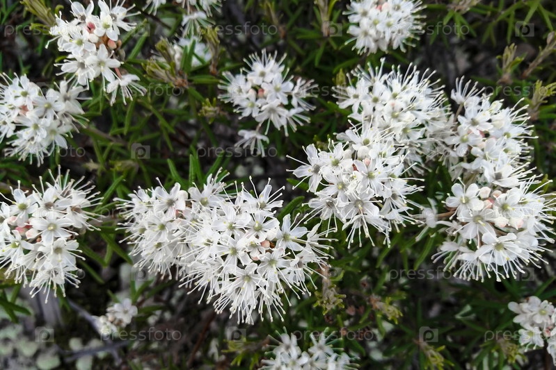 Маленькие белые соцветия кустарника багульника из семейства вересковых рода рододендронов, растущего в северной тундре. Летняя природа тундры. Уникальная полярная флора