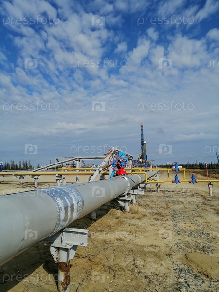 Трубопроводная арматура и манифольд добывающих газовых скважин на месторождении. Маховики для клапанов высокого давления. На заднем плане буровая установка. Размытие удаленных объектов