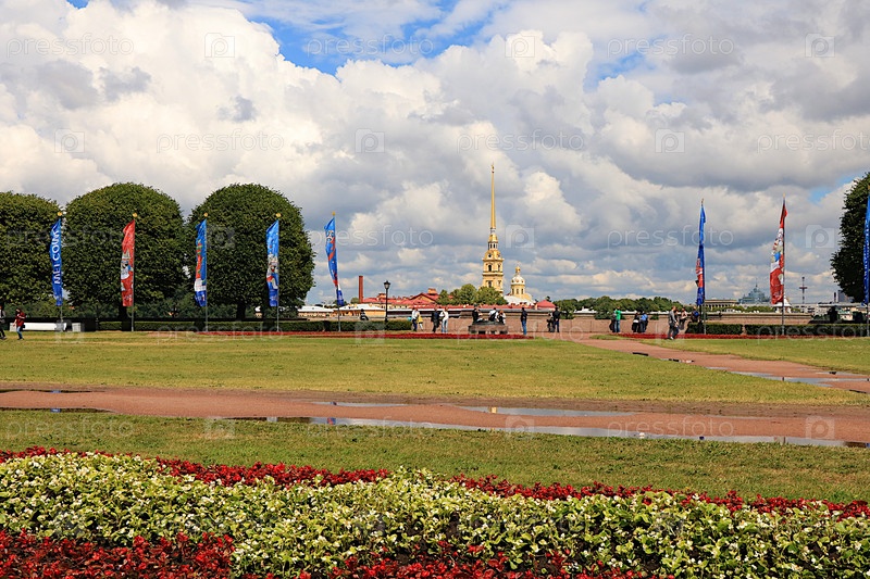Россия, Санкт-Петербург, 3 июля 2018 года, Биржевая площадь на Стрелке Васильевского острова. На фото Биржевая площадь, на заднем плане Петропавловская крепость