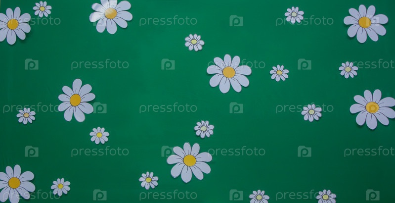 Украшение, белые ромашки на зеленом фоне из текстиля