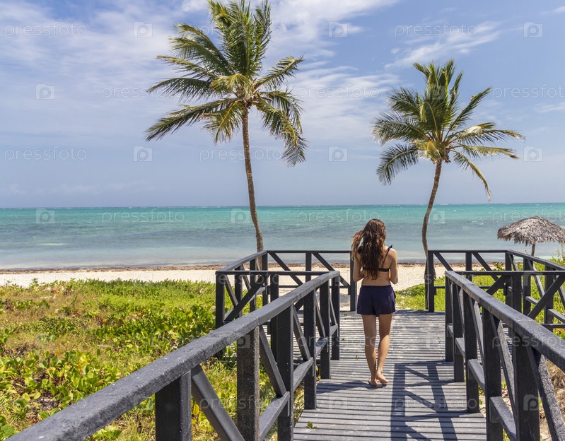 Снимок красивой женщины, идущей к пляжу на тропическом острове. Праздничный день