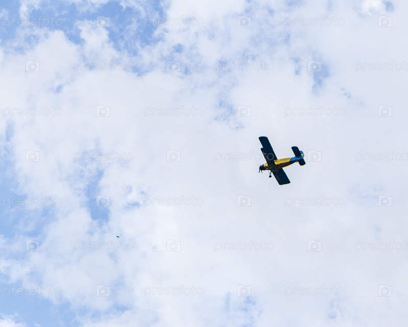 Снимок старого биплана и птиц в небе. Винтаж