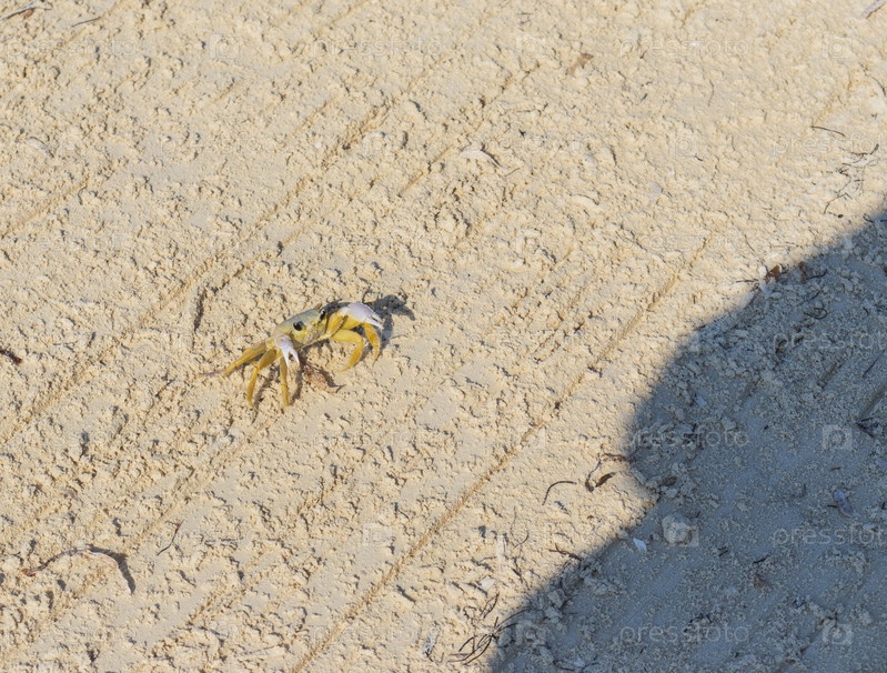 Крупный план маленького краба на песке. Дикая природа