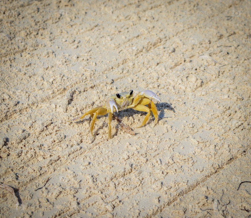 Крупный план маленького краба на песке. Дикая природа