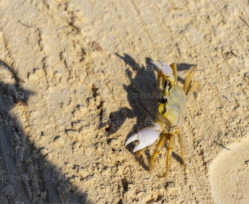 Крупный план маленького краба на песке. Дикая природа
