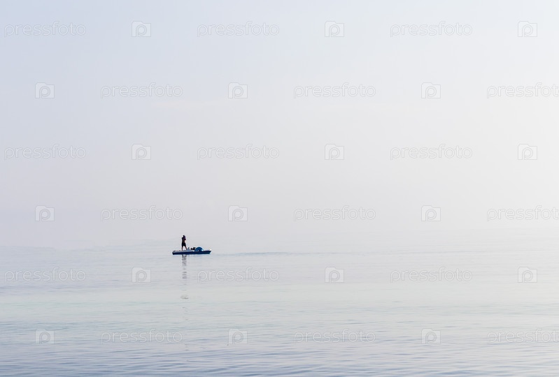Снимок человека на небольшом катамаране у горизонта, который трудно обнаружить из-за тумана и влажности. На открытом воздухе