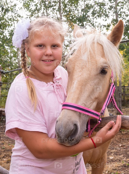 На улице в прекрасный теплый день девочка гладит лошадь