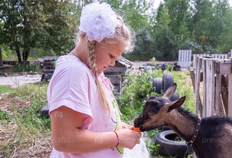 На улице в прекрасный теплый день девочка кормит козу