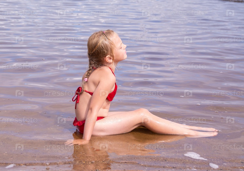 В жаркий летний день ребенок отдыхает на озере. Девочка на пляже. В знойный летний день ребёнок расслабляется у озера