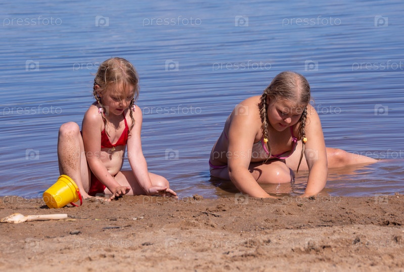 В жаркий летний день дети отдыхают на озере. Девочки на пляже. Сестры. Ребенок - модель. В знойный летний день, дети расслабляются на озере. Девушки на пляже. Сестры. Ребёнок является моделью