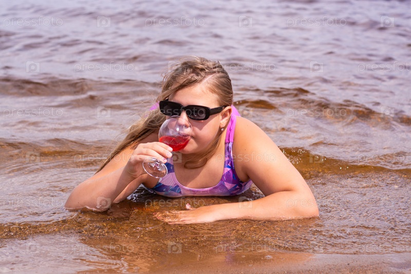 В жаркий летний день ребенок отдыхает на озере. Девочка на пляже. Девушка пьёт вкусный свежий сок. В жаркий летний день ребенок расслабляется на озере. Девушка на пляже. Девушка пьет восхитительный свежий сок