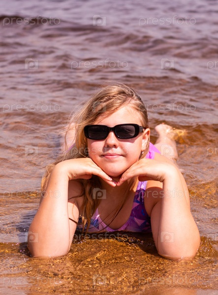 В жаркий летний день ребенок отдыхает на озере. Девочка на пляже. В знойный летний день ребёнок расслабляется у озера