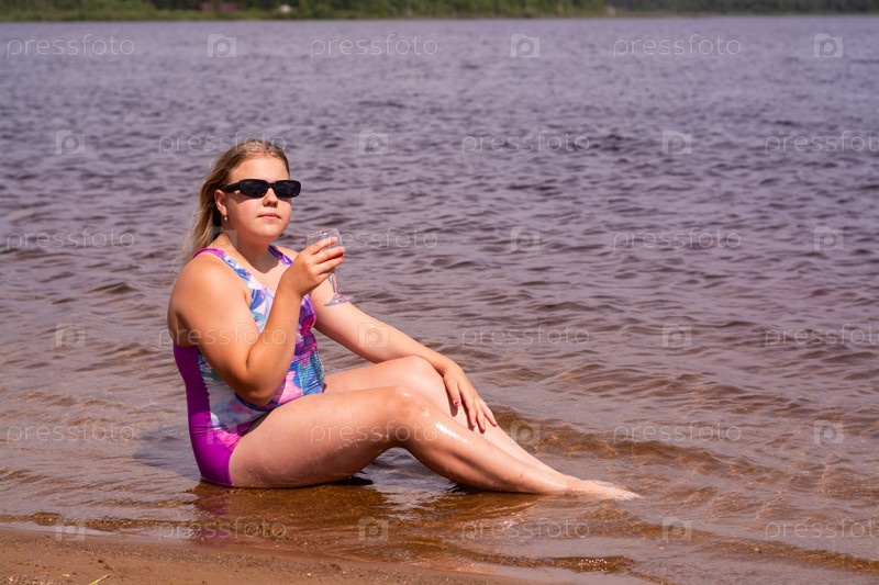 В жаркий летний день ребенок отдыхает на озере. Девочка на пляже. Девушка пьёт вкусный свежий сок. В жаркий летний день ребенок расслабляется на озере. Девушка на пляже. Девушка пьет восхитительный свежий сок