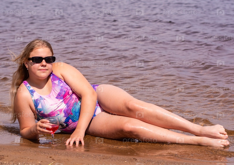 В жаркий летний день ребенок отдыхает на озере. Девочка на пляже. Девушка пьёт вкусный свежий сок. В жаркий летний день ребенок расслабляется на озере. Девушка на пляже. Девушка пьет восхитительный свежий сок