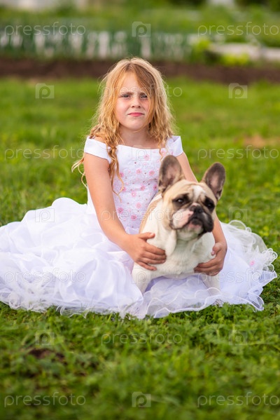 В жаркий летний день на улице красивая одетая девушка держит в руках французского бульдога. Девушка-модель и собака