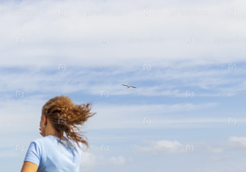 Концептуальный снимок чайки в облачном небе. На переднем плане женщина с развевающимися по ветру волосами. На открытом воздухе