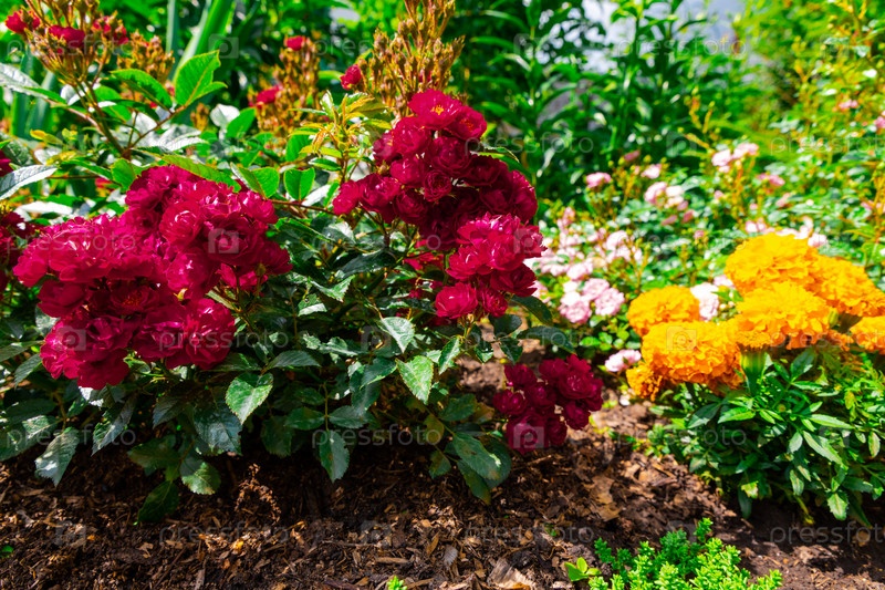 Кустовая красная роза в саду. Выращивание цветов. Маленькие цветы. Цветочный фон