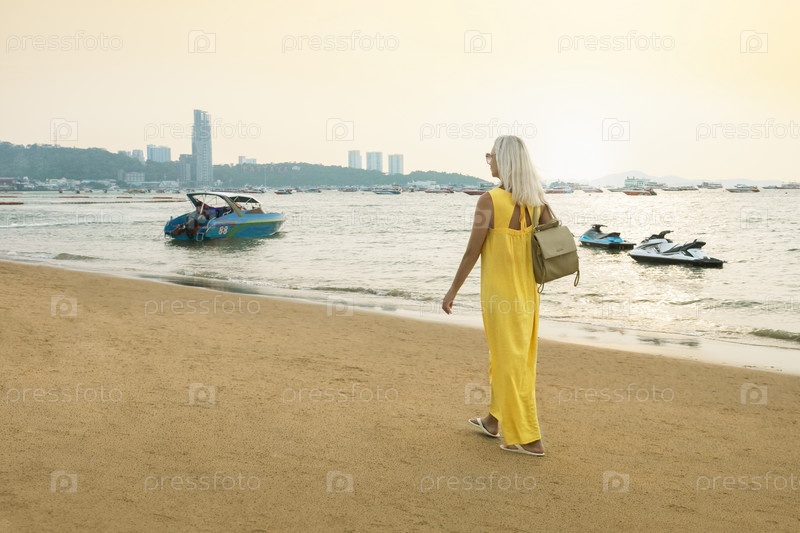 Женщина-туристка в красивом желтом платье гуляет по пляжу на золотом закате в городе Паттайя, Таиланд